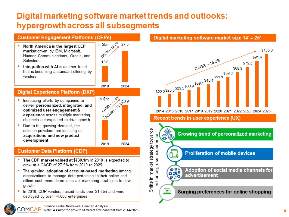 As the traditional agency model continues to evolve, full-service platforms are gaining the most traction in the market as ecommerce platforms and marketing suites continue to consolidate. Many players in the space are continuing to differentiate through both platform and marketing expertise, making them attractive investment targets for strategic and financial investors.